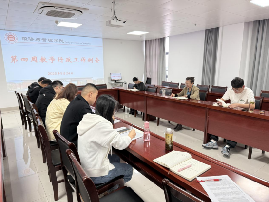 2025 年 9 月24日上午,437必赢会员中心在行政楼725 会议室召开第四周教学行政工作例会。院长吴玲主持会议,院长助理张珊、叶赵强,教学秘书李健,各教研室主任及相关行政人员参会。