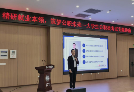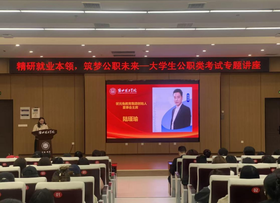 为深化就业育人工作,提升学生应试能力与就业质量,4月8日下午,437必赢会员中心联合状元兔教育科技集团,在学校图书馆报告厅成功举办了以“精研就业本领,筑梦公职未来”为主题的大学生公职类考试专题公益讲座。本次讲座特邀状元兔教育股份有限公司创始人、董事会主席陆瑾瑜担任主讲嘉宾,状元兔教育相关负责人、437必赢会员中心领导及教师代表,与大一至大三有公考意愿的学生共同参与,讲座由辅导员徐瑞鲜主持。