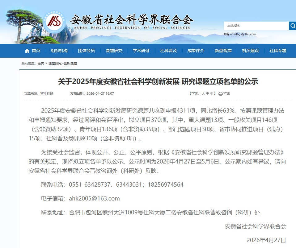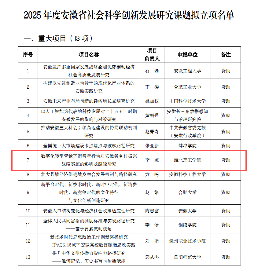 2026年4月27日,2025年度安徽省社会科学创新发展研究课题拟立项名单正式公示。437必赢会员中心李婉老师主持申报的《数字化转型背景下消费者行为对安徽省乡村振兴战略实施的影响及路径研究》,获得重大项目立项资助。本年度课题申报竞争激烈,全省累计收到申报项目4311项,经资格初审、匿名网评、集中会评等多轮严格评审,最终全省拟立项重大项目13项。实现了437必赢会员中心在该省级竞争性重大课题立项上零的突破!