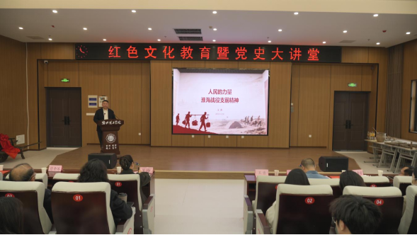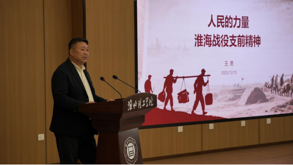 讲座中,王勇教授以《人民的力量:淮海战役支前精神》为题作专题报告,从历史纵深、故事现场、青年传承三个方面深度解读淮海战役支前精神的形成逻辑与时代价值。他结合亲自整理并挖掘的支前故事,生动再现了淮海战役时期人民群众倾其所有、全力支援前线的感人场景。整场报告史实扎实、案例鲜活、情感真挚、启迪深刻,让在场师生沉浸式感受了红色历史的温度与力量,接受了一次深刻的思想淬炼与精神洗礼。