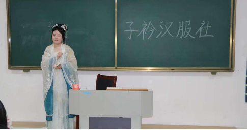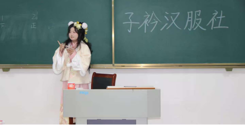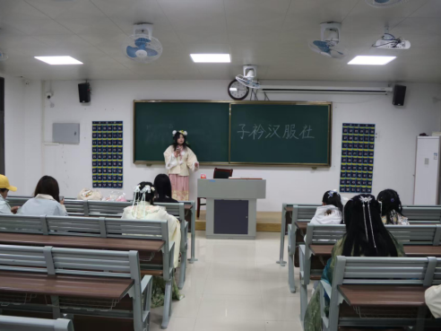 活动伊始,在身着传统服饰的社长的引导下,学生们有序入座。随后,她为大家详细介绍了本次活动的主题背景与流程,并深入阐释了中秋文化与汉服文化融合的重要意义。她在讲台上娓娓道来,引领大家逐步沉浸于浓郁的中秋氛围之中。