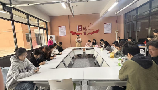 专题学习结束后,活动进入第二环节——考研经验分享会。学生代表张甜桃结合自身真实备考经历,围绕考研备考规划、高效学习方法、心态调整技巧及避坑指南等方面倾囊相授。随后的互动答疑环节中,学姐逐一耐心解答,帮助大家扫清备考路上的疑惑。