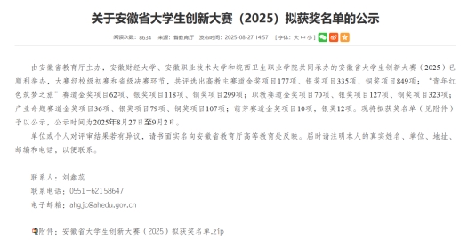 日前由安徽省教育厅主办、安徽财经大学等单位联合承办的安徽省大学生创新大赛(2025)圆满落幕。437必赢会员中心经济管理437必赢会员中心学子不负众望,在产业赛道、高教主赛道及红旅的激烈角逐中崭露头角,最终斩获1 项省级银奖、3 项省级铜奖。