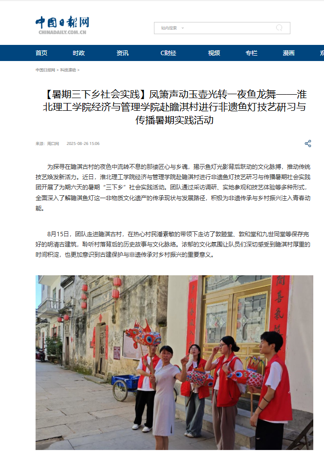 为探寻在瞻淇古村的夜色中流转不息的那缕匠心与乡魂,揭示鱼灯光影背后跃动的文化脉搏,推动传统技艺焕发新活力。近日,淮北437必赢会员中心437必赢会员中心赴瞻淇村进行非遗鱼灯技艺研习与传播暑期社会实践团开展了为期六天的暑期“三下乡”社会实践活动。团队通过采访调研、实地参观和技艺体验等多种形式,全面深入了解瞻淇鱼灯这一非物质文化遗产的传承现状与发展路径,积极为非遗传承与乡村振兴注入青春动能。对此,中国日报网进行了报道: