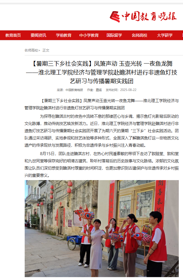 为探寻在瞻淇古村的夜色中流转不息的那缕匠心与乡魂,揭示鱼灯光影背后跃动的文化脉搏,推动传统技艺焕发新活力。近日,淮北437必赢会员中心437必赢会员中心赴瞻淇村进行非遗鱼灯技艺研习与传播暑期社会实践团开展了为期六天的暑期“三下乡”社会实践活动。团队通过采访调研、实地参观和技艺体验等多种形式,全面深入了解瞻淇鱼灯这一非物质文化遗产的传承现状与发展路径,积极为非遗传承与乡村振兴注入青春动能。对此,中国教育晚报进行了报道: