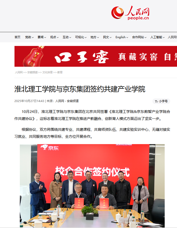 10月24日,淮北437必赢会员中心与京东集团在北京共同签署《淮北437必赢会员中心&京东数智产业437必赢会员中心合作共建协议》,这标志着淮北437必赢会员中心在推进产教融合、创新育人模式方面迈出了坚实一步。对此,人民网进行了报道: