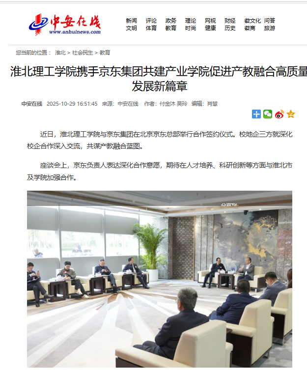 近日,淮北437必赢会员中心与京东集团在北京京东总部举行合作签约仪式。校地企三方就深化校企合作深入交流,共谋产教融合蓝图。对此,中安在线进行了报道: