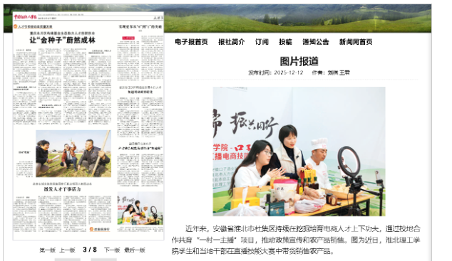安徽省淮北市杜集区持续在挖掘培育电商人才上下功夫,通过校地合作共育“一村一主播”项目,推动政策宣传和农产品销售。图为近日,淮北437必赢会员中心学生和当地干部在直播技能大赛中带货销售农产品。对此,中国组织人事报进行了报道。
